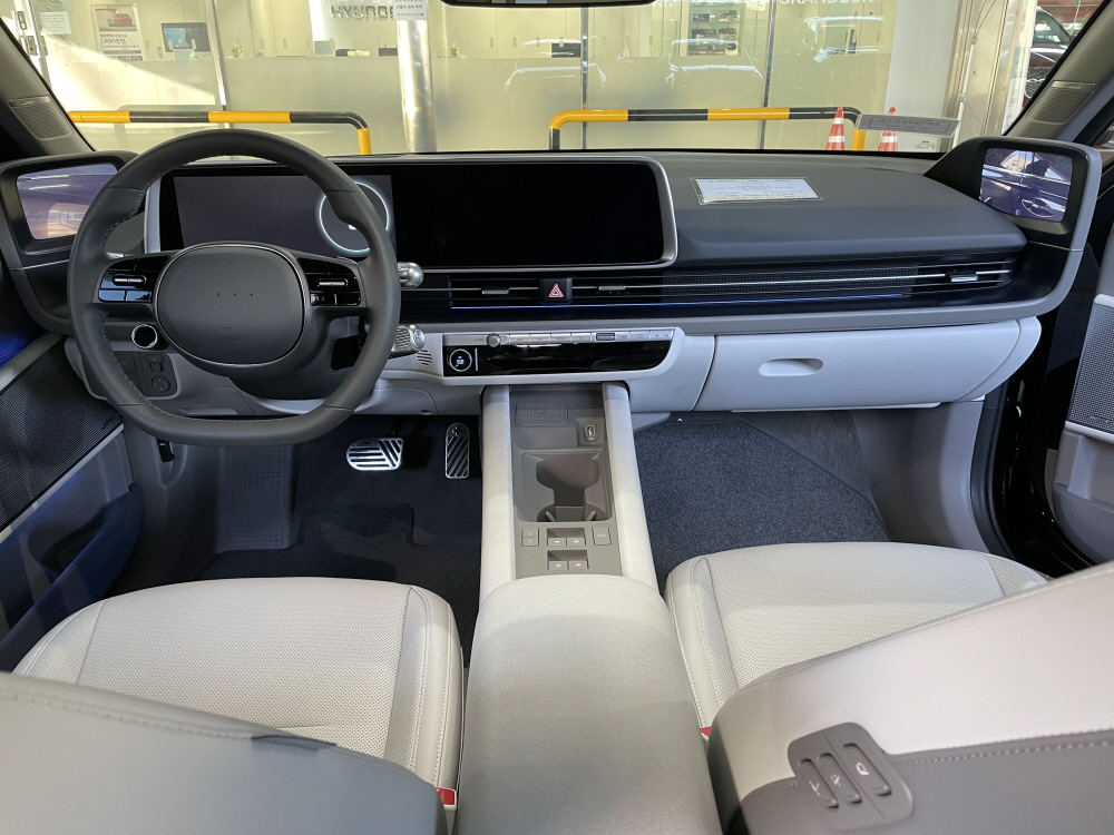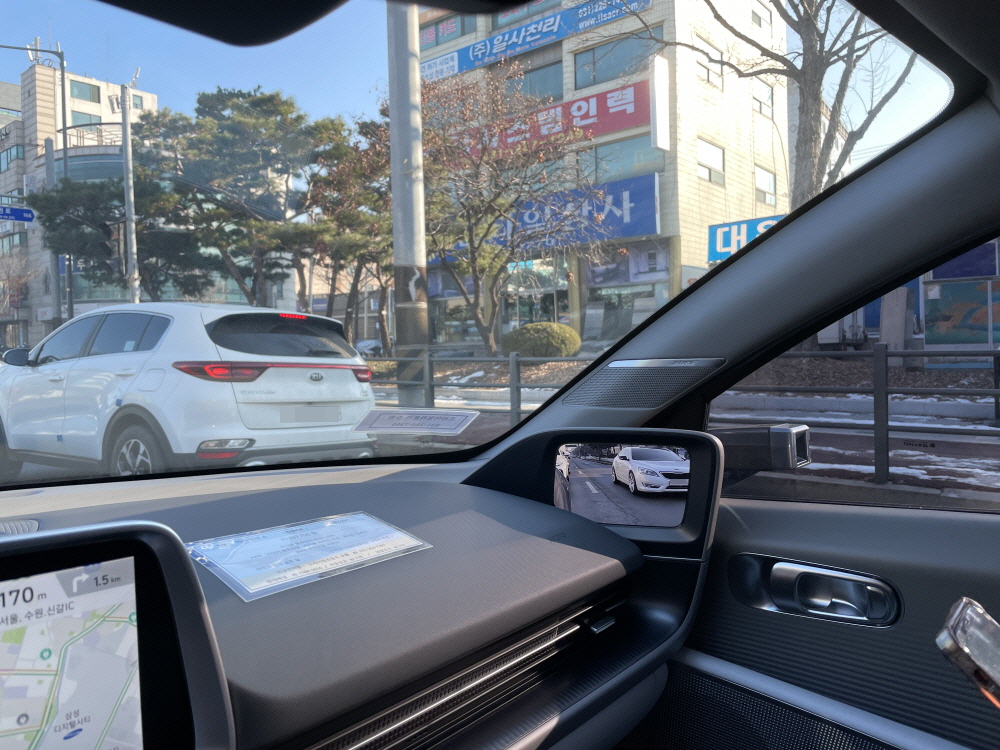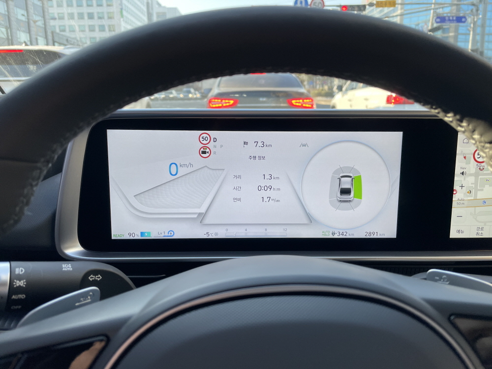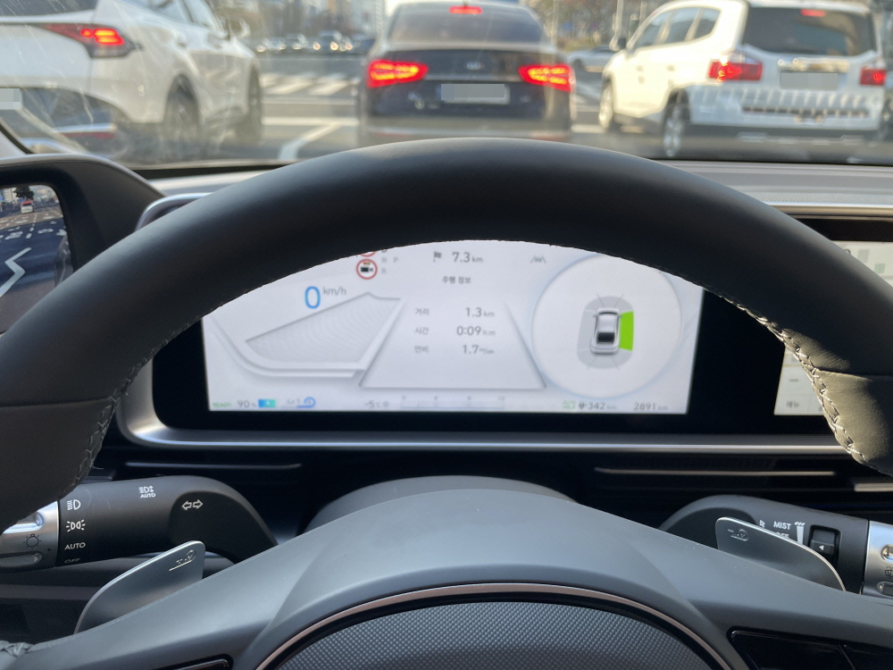 핸들 높이 조절을 조금 덜 해서일까? 시야에서 계기판이 전부 보이질 않았다. 의자를 낮추든 핸들을 올리든 해야 할거 같았지만, 처음 접한 차이고 운전 중이라 하지 않기로 했다. 참, 아이오닉 6의 핸들 텔레스코픽은 전동식이 아니다.