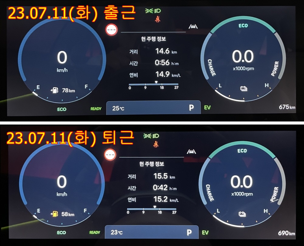 23.07.10(월) ~ 07.15(토) 출근 평균 연비 약 18.5km/l, 퇴근 평균 연비 약 15.0km/l (한 주간)