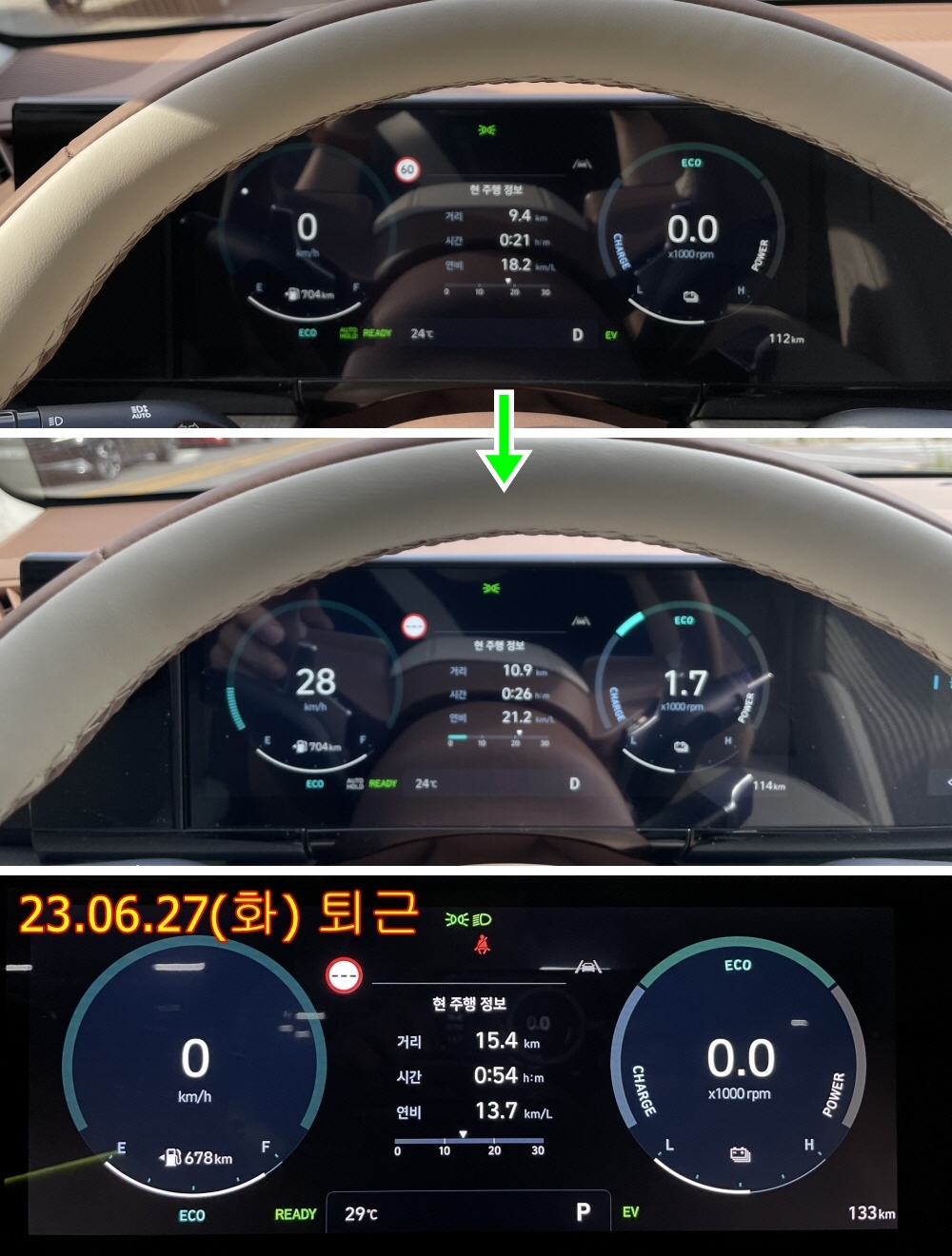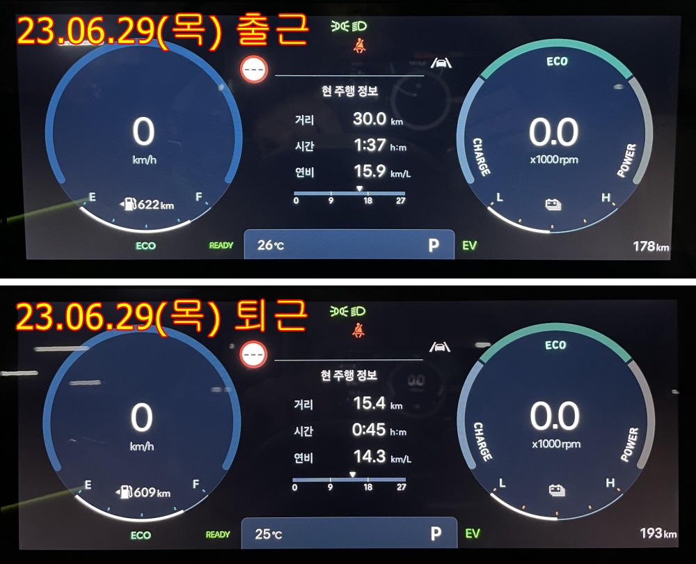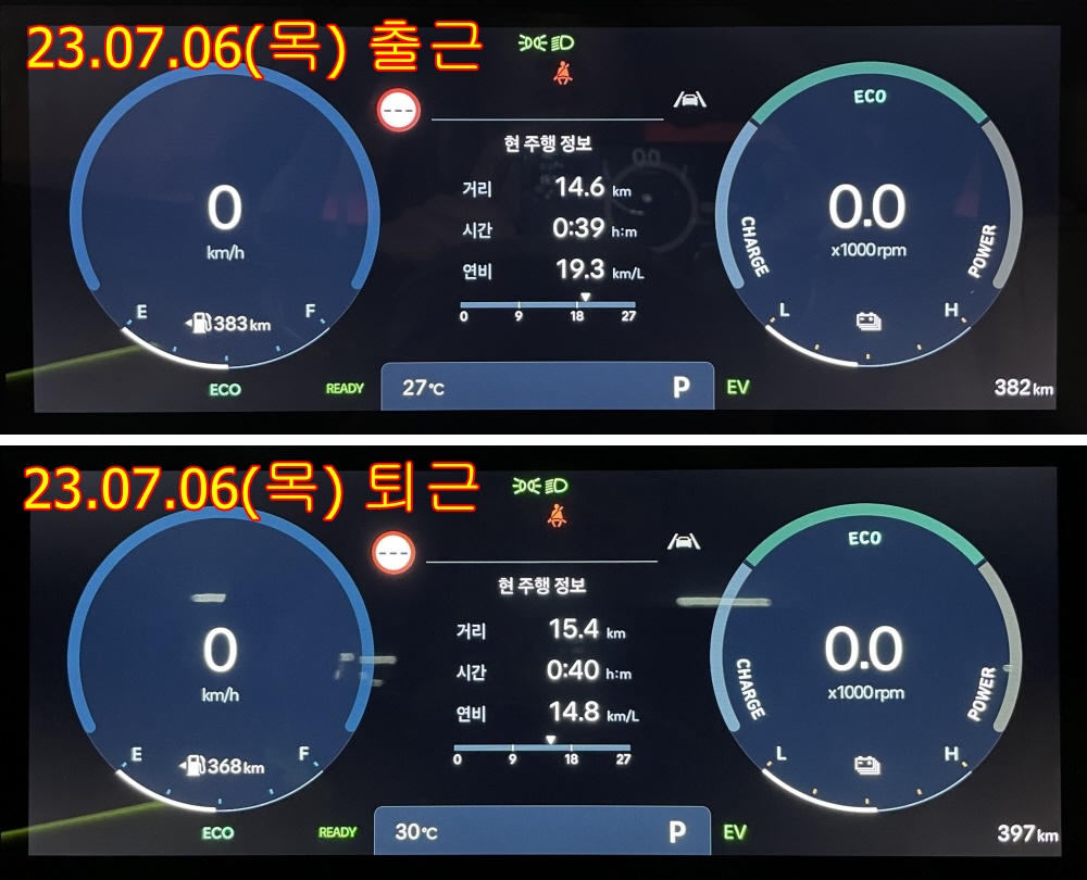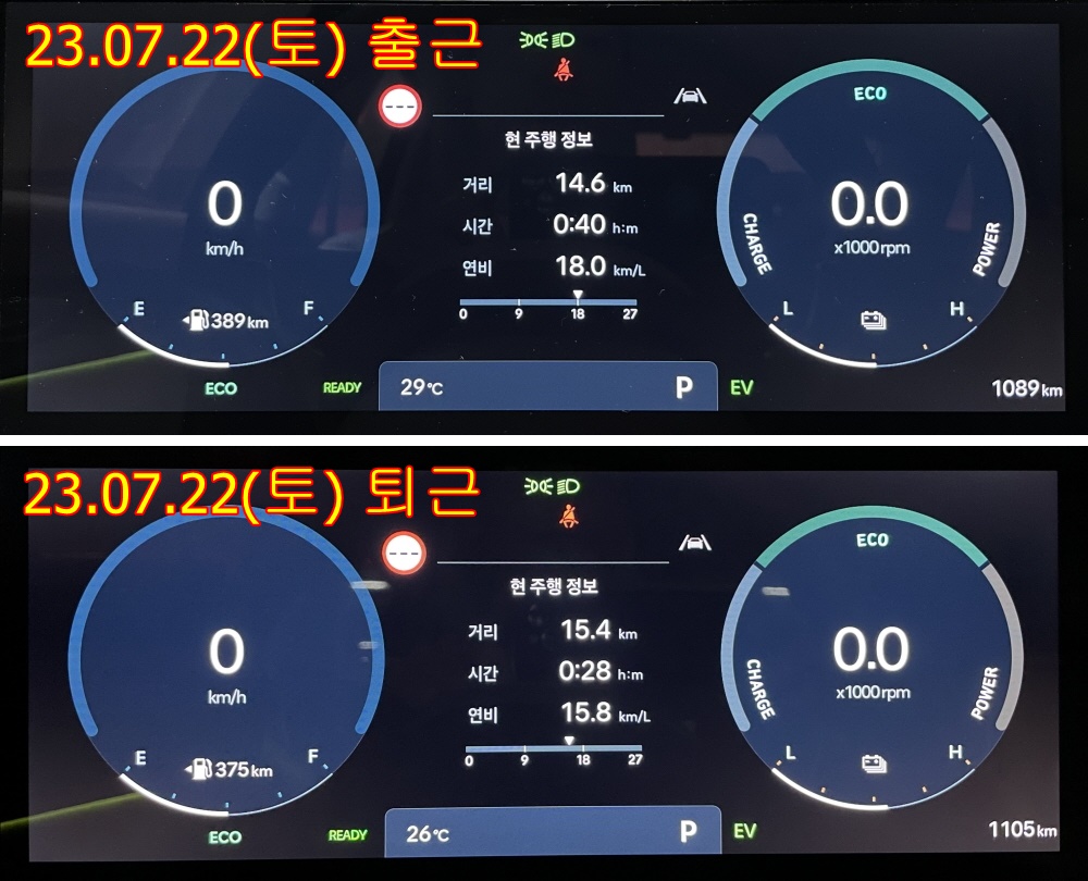 출근 15.4km/l, 퇴근 15.9km/l