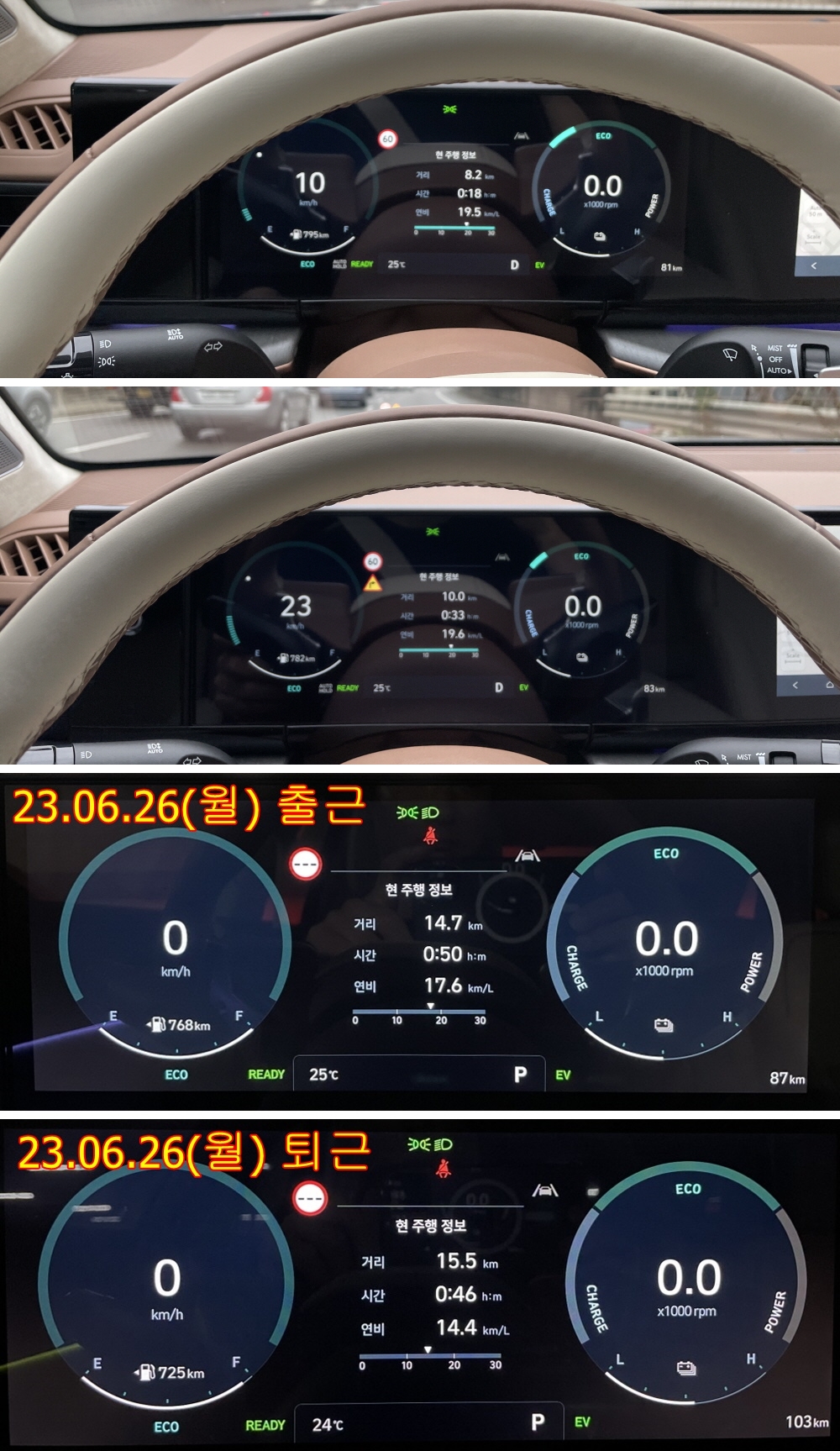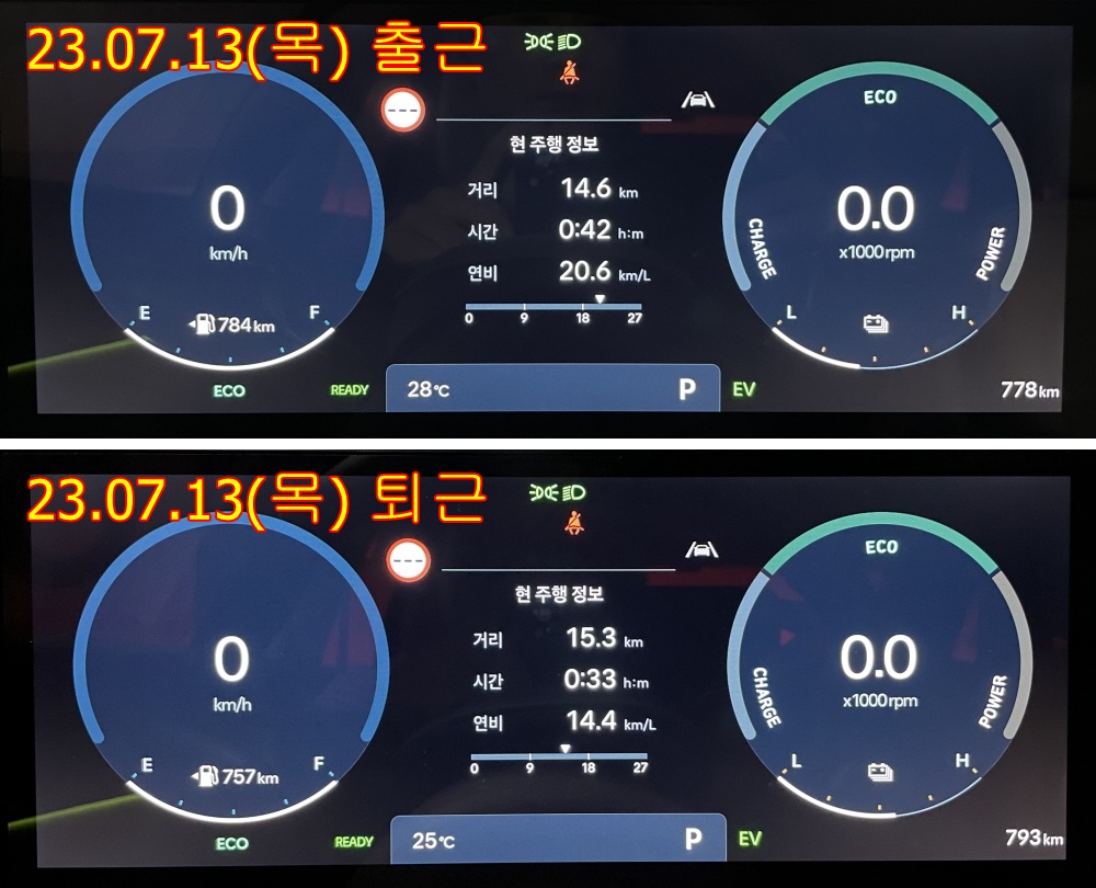 출근 20.5km/l, 퇴근 14.7km/l
